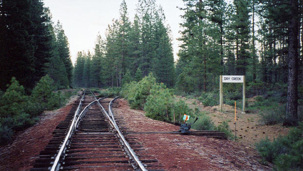 Dry Creek station sign and spur, looking eastward towards Bartle. June 2004. |
