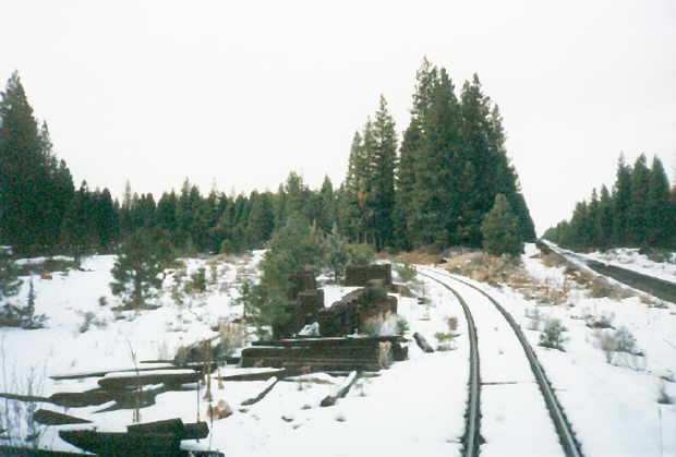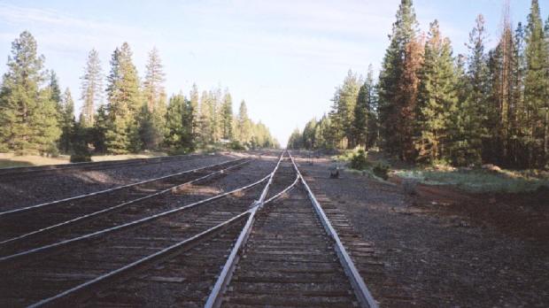(Picture: #177) 12/1997 Looking north from Lookout Junction. The track on the right in the BNSF mainline north to Klamath Falls; the track curving to the left is part of the loop used to turn McCloud trains. The Lookout Junction yards are behind the photographer. |