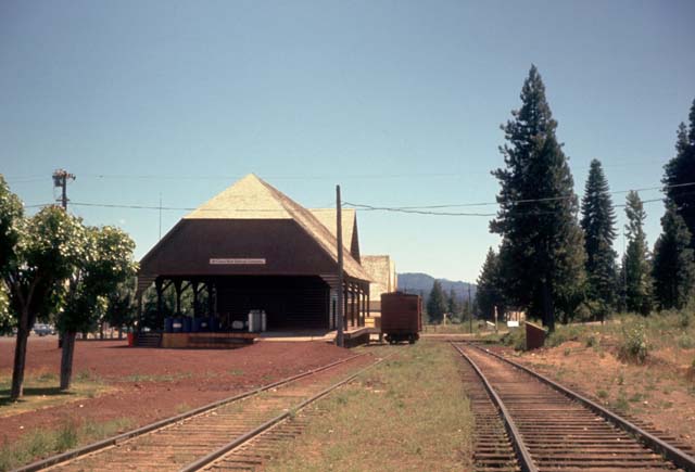 The railroad's VIP caboose posed in front of the McCloud depot circa 1971 in this photo by George Landrock. This depot building was built in the summer of 1929 at a cost of $18,000. It housed the offices and headquarters of the railroad from then until 22 December 1990, when it was completely destroyed by fire. The two story tall brick vault is the only remnant of the building left standing; the remainer of the site served as the parking for the Shasta Sunset Dinner Train. In late 2016, 4-Rasils Inc. conveyed the building location to the local community health clinic, who is in the process