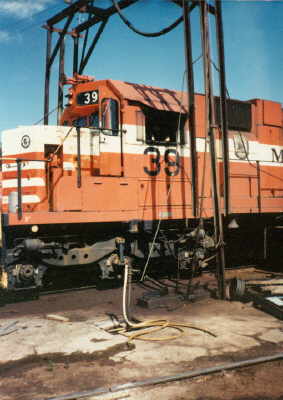 McCloud, CA, 6/1992. The #39 sits underneath the sanding tower in the McCloud yard. Notice that two of the three supports are cut off above ground level. A few weeks before this picture was taken a flat car loaded with pipe got away from a crew working in the yard and rolled down under the sanding tower, snapping both of these supports off as it went. Photo by Anna Moore. |