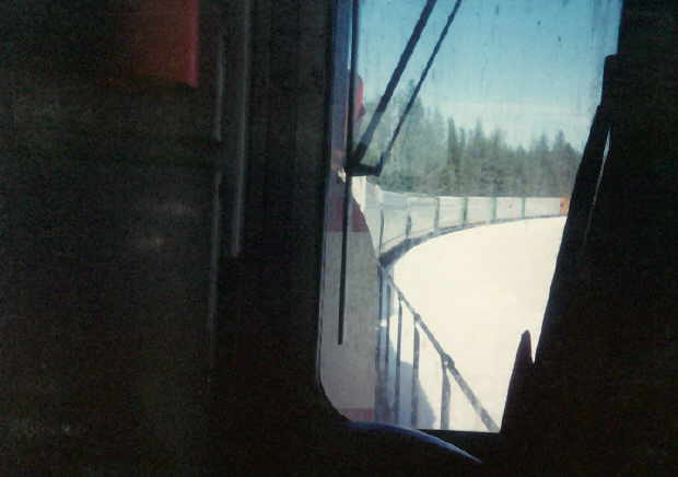 (Picture: #167) 1/1993. Four cars of lumber, three cars of diatomaceous earth, and caboose #101 are seen here from the cab of #39 on Nebraska Curve.