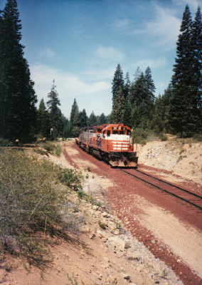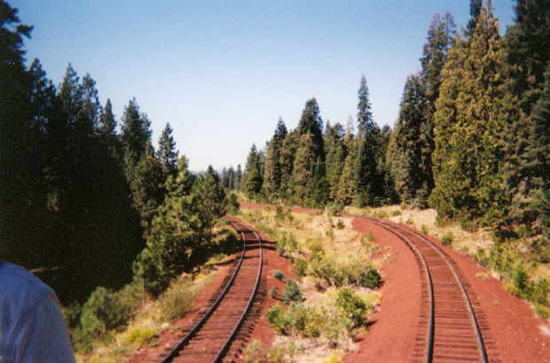6/1992. The empty pipe train continues westward towards Mt. Shasta City. The crossing of the Ski Park Highway can be seen in the distance; the Pierce siding is just beyond the crossing. Photo by Anna Moore. |