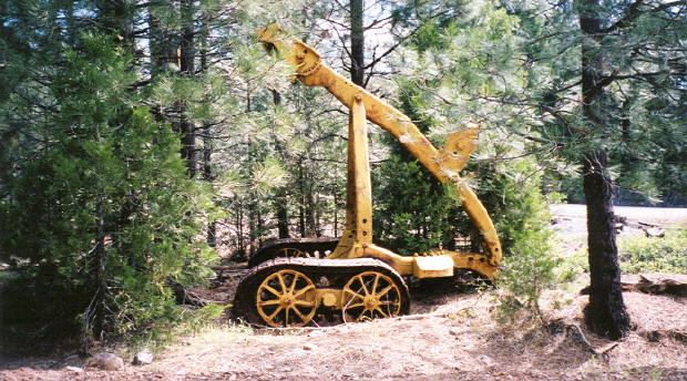An old tracked logging arch sitting at the entrance to the old Cheney-Grant sawmill complex. |