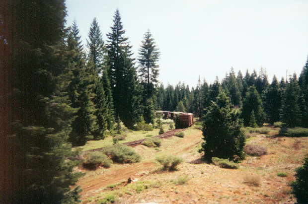 5/2003. The Pondosa Branch is seen here curving away from the mainline at Bear Flat. The boxcars are in long-term storage on the branch. A wye used to exist at this location, with the third leg curving back into the mainline to the right. Bear Flat and Upper Pondosa yards used to exist in this area, and the forest floor is littered with old railroad grades in this entire area. |