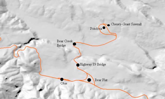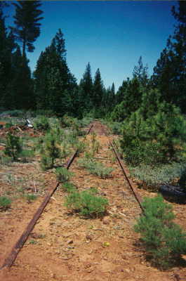The Pondosa Branch extended from Bear Flat four miles into Pondosa. The entire line was in place by the 1940’s, as it was the start of the lumber company line south into the Ditch Creek country and the harvest activities taking place in the Clark Creek drainage. Pondosa was established in October of 1927 as the first permanent log camp of the lumber company. However, Pondosa had not been in business very long before the lumber company purchased the Whitehorse tract and started operations in it. Pondosa was actually closed for a time in the early 1930’s as the lumber company focused it’s energies to the east. Operations resumed in the mid-1930’s. Pondosa-based crews first harvested the extensive holdings in the Bear Creek Drainage before shifting south to the Ditch Creek country. Pondosa as a camp remained active up until 1964, when U.S. Plywood consolidated all logging operations into McCloud. Harry Horr moved his sawmill from Cayton Valley to Pondosa in 1930. The mill was sold to the Cheney Grant Lumber Company in the 1940’s. Cheney Grant provided sufficient traffic through the 1960’s and 1970’s to warrant three trains a week up the branch. The branch was worked by the regular Burney freights. Cheney Grant sold out to Louisiana Pacific in the late 1970’s, and shortly afterwards the sawmill shut down. The branch was used to store boxcars for a while after the closure of the sawmill. However, the branch crossed the county road three times in four miles, and the railroad eventually tired of maintaining three crossings on a railroad that did not produce any revenue. The branch was scrapped in the mid-1980’s to a point just before the first grade crossing. Highway 89 was crossed by a low bridge that was a thorn in the side of state highway department, and a deal was worked out that saw the bridge come out about 2000.