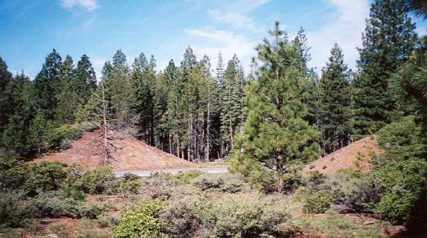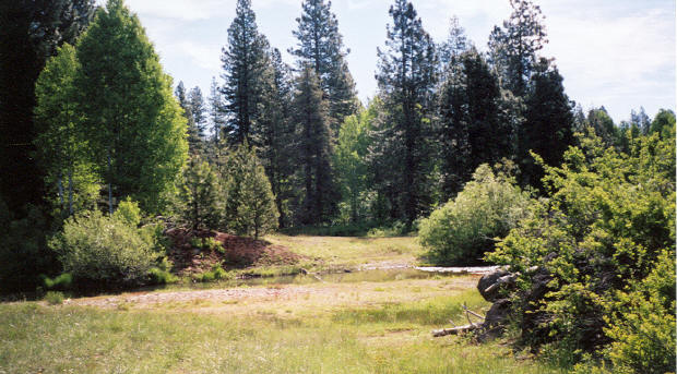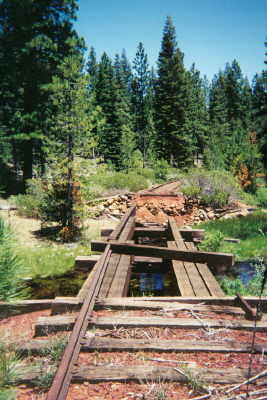 5/2003. Remains of a bridge on the Pondosa branch. McCloud Rails staff originally believed that this bridge had been washed out; however, we received an e-mail from Matt Simons containing the following information. "I was looking through everything on your website this evening and noticed something that wasn't quite accurate. On the Pondosa branch, the bridge one mile east of the old highway 89 crossing was not washed out. In the fall of 2000, myself, Jeff Harris, Mark Sietzinger, and Eddie Padula removed the main support beams to be used to repair the old warehouse in McCloud. It was in perfect shape when we arrived. The plan was to remove all of the 9"X17"X30' timbers, but other maintenance tasks prevented us from going back. It was cool to help take the thing apart. All of the construction was so solid we had one heck of a time getting those beams apart! We ended up shattering the pivot gear on the old white boom truck, so we were only able to get five timbers back to McCloud." Thanks to Matt for the correction! |