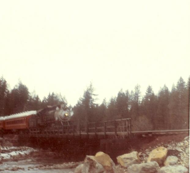 The #25 crossing the bridge over Bear Creek in 1970, This was the last time a steam locomotive operated into Pondosa. Photo by and courtesy of Dennis Sullivan. |