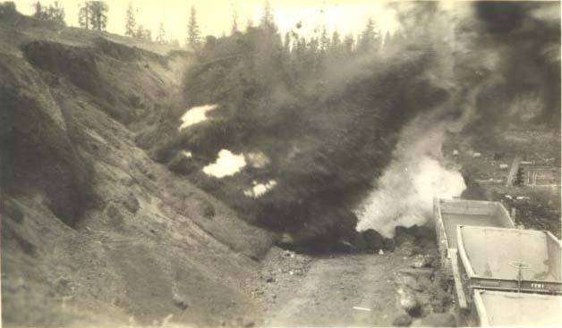 Below are two shots of early ballast mining and loading operations at Porcupine. Note that log flats with gondola sides are being used as ballast hoppers. Photos courtesy of Heritage Junction Museum of McCloud, Inc. |