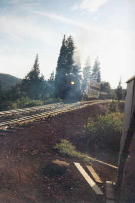 Circa 1999. The #25 has just gone through the switchback and is in the process of backing down to McCloud. The tail track is behind the photographer; the track to the left under the train goes to McCloud; and the track to the right goes to Mt. Shasta City. Photo by Anna Moore. |