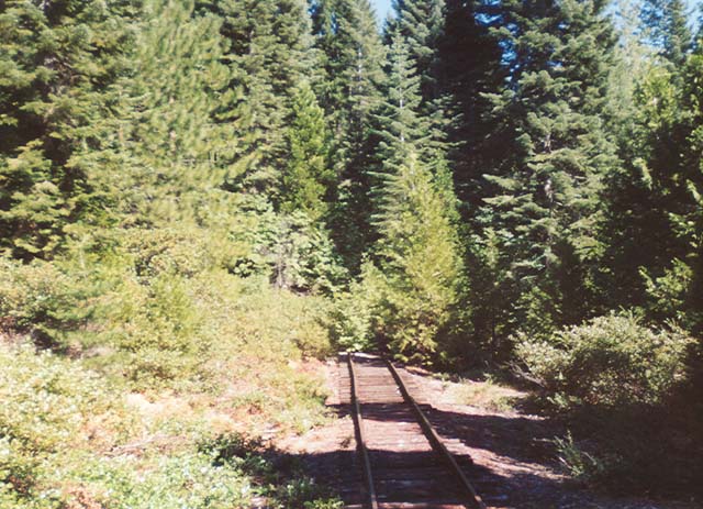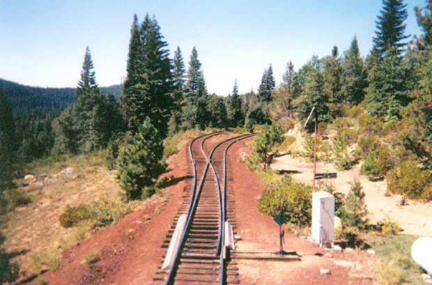 Signal Butte: Track on left goes to McCloud, track on right goes to Mt. Shasta City. Grey structures on outside of rails contain propane burners that prevent the switch from freezing shut during winter. |