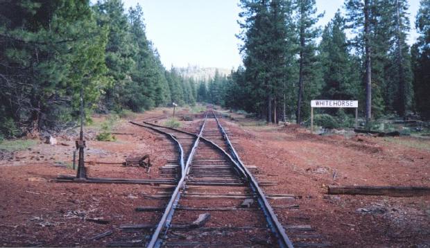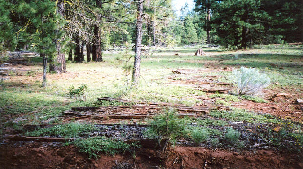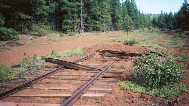 Rotting ties mark the grade of an old spur line that once ran into the camp.