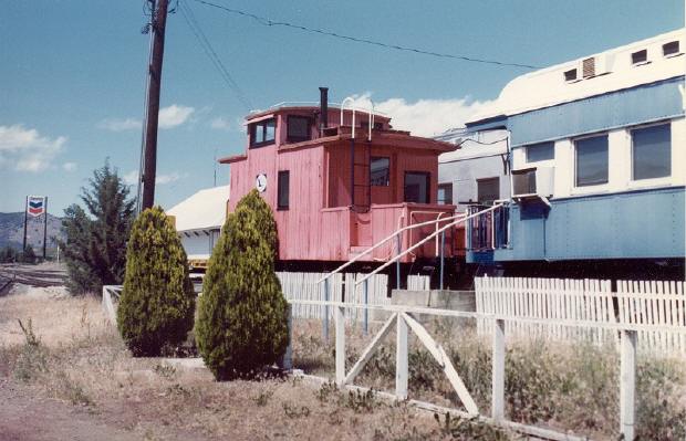 | The #025 received a red paint job following its arrival on the Yreka Western in the mid-1960's. This photo from the dawn of the 1980s finds the caboose sitting in the yard at Yreka, CA. Jimmy Bryant photo, courtesy of Nevada Historical Society. |