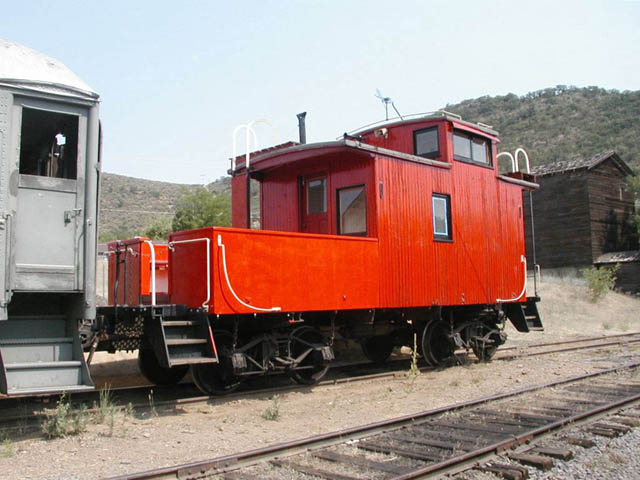 | By the end of 2007 the caboose really started showing its age, which prompted the Yreka Western to rebuild the car in their Yreka shops over the winter of 2007/2008. The work involved stripping the open end of the caboose down to the frame, with steel beams inserted in place of the end beam and under the floor of the porch. The company next installed new deck constructed of 2x6 tongue & groove flooring. The YW could not find a ready supply of V-groove siding, which forced them to use plywood in the rebuild of the short walls around the porch area. This photo shows the caboose on 12 July 2008, immediately after its first run after emerging from the shops. The railroad still had to install a railing across the top of the new sides, apply a couple additional coats of new paint, and lettering. Photo by and courtesy of Larry Tuttle. |