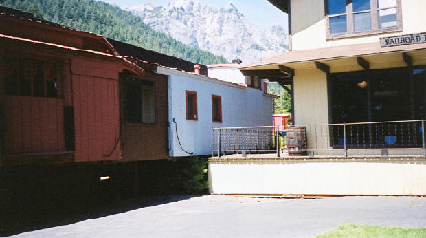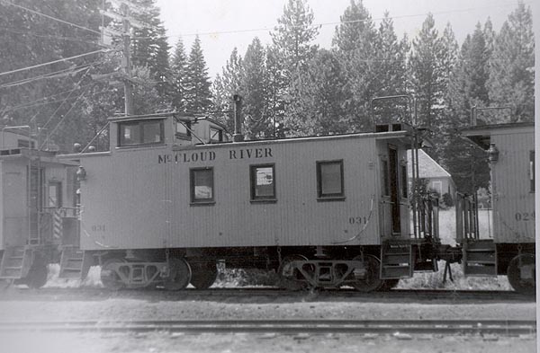 Caboose #031 coupled to two other cabooses near the McCloud depot. Photo from the Travis Berryman collection. |