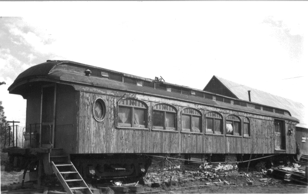 | Coach #02 in the McCloud yards, after it was retired but before it was removed from its trucks. Photo courtesy of Jerry Lamper. |
