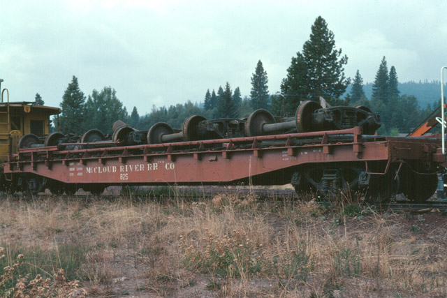 the railroad started designating flats specifically for work service starting in the 1930s. 500, 501, 502- 51-foot, 6-inch long, 50-ton capacity flat cars, ex-Atchison Topeka & Santa Fe (ATSF) #2562, #2563, and #2565. Purchased 11/1956 from Bottsford. Cost $2304.90. #500 retired 1971. #501 converted circa 1963 to a passenger flat, then converted back to m-o-w use by the late 1970s. By mid-1980s the car had been assigned to Burro crane #1851 as a boom car. Deeded circa 1987 to Great Western Railway Museum as part of a lawsuit settlement. Stored in McCloud 1987-2010, then purchased at auction by owner of land it rested on. Scrapped fall 2010. #502 converted to a passenger flat shortly after arrival and retired by the early 1980s. 583- Material car, converted from log flat #583. Converted 10/1928 to log flat #1961. 741/1519- 38-foot Donkey flat, built 2/1910 in company shops. Equipped to carry steam donkey engines. Re-numbered circa 1924 to #1519; Retired 9/1934. 820- 50 foot flat car, purchased circa 1971. Appears to be SP class F-70-10 flat. Specially equipped as a transport vehicle for the Cat 966 loader. Sold 1992 to McCloud Railway. Loading ramps removed circa 1993. Car appears to have been re-built 1995 to passenger flat #827. 821- 50 foot flat car, purchased circa 1971. Appears to be SP class F-70-10 flat. Likely ex-SP. Started out as a m-o-w flat. Coverted 7/1972 to sand car by mounting an 8,000 gallon tank car body (likely salvaged from a 2000-series tank car) onto the flatcar. Listed as #504 in The Official Railway Equipment Register after 1977, though photograph evidence only shows the car stenciled #821. Received roller bearing trucks circa 1990. Sold 1992 to McCloud Railway. In late 1992/ early 1993 the railroad rolled the sand car body off the flat and rebuilt the car to the new equipment transport flat, replacing the #820 in this service. Loading ramps removed by 2007, and the flatcar remains stored in McCloud pending disposition. 822- 50 foot flat car, purchased circa 1971. Appears to be SP class F-70-10 flat. Used in general m-o-w service. Sold 1992 to McCloud Railway. Received roller bearing trucks. In 1998, the railroad mounted railings and a loading ramp on the car, dedicating it to troop train service during the annual Civil War days in McCloud. Scrapped late 2006 in McCloud. 823- 50 foot flat car, purchased circa 1971. Appears to be SP class F-70-10 flat. Used in general m-o-w service until 4/1977, when the railroad mounted the tank car body from sand car #503. The Official Railway Equipment Register continued listing the car as #503 after the conversion, though photographs show the car stenciled only as #823. Sand car dismantled circa 1988, with flatcar converted back to work service. Sold 1992 to McCloud Railway. Scrapped 1/2008. 824- 50 foot flat car, purchased circa 1971. Appears to be SP class F-70-10 flat. Used in general m-o-w service. By mid-1980s the railroad had mated the car to Crane #70 and had given it a black paint job to match the crane. Received roller bearing trucks circa 1990. Sold 1992 to McCloud Railway. Re-built spring 1994 as a passenger flat. A photo page of this car can be found in the Passenger Equipment section off the Equipment Roster page. 825- 50 foot flat car, purchased circa 1971. Appears to be SP class F-70-10 flat. Used in general m-o-w service. Retired circa 1992. 826- 57 foot flat car. Unknown origin or acquisition date, but appears to be a former SP flat. Converted spring 1995 to a passenger flat. A photo page of this car can be found in the Passenger Equipment section off the Equipment Roster page. 1000- 50-foot flat. Converted circa 1977 from PLYX #1000. Short remnants of the car ends left in place as bulkheads following the conversion. The railroad initially used the car to handle intraline lumber movements between P&M Cedar Products mills in McCloud and Mt. Shasta City, and then later primarily as a tie car. Sold 1992 to McCloud Railway. Received roller bearing trucks. By 1998 the McCloud Railway installed railings and a loading ramp on the car and dedicated it to troop train service during the annual Civil War days in McCloud. Scrapped late 2006 in McCloud. 1001- Flat car, converted in early 1980s from an all door car for on-line lumber shipments. Equipped with log bunks by the late 1980s. Scrapped circa 1990. 1217,1231, 1247, 1271, 1279, 1285, 1433- Rail and tie flats, converted 1930-1932 from log flats of the same number. All cars except 1217 and 1285 retired 6/1949, with the last two retired late 1958/early 1959. 1719, 1721: Material flat cars, 30-ton capacity, built 5/1940 by McCloud car shop. Originally classified as tie cars, then equipped July 1941 with temporary tracks. Both converted to water cars of the same number prior to 1948. 1927- Rail flat, converted circa 7/1932 from log flat of the same number. Retired 6/1949. 2245, 2261- Maintenance of way flats. #2245 converted 1950 from water car #2061; #2261 converted from log flat of the same number. Both cars retired circa 1965. 2331- 38-foot flat, rebuilt 4/1948 from SP stock car #74598 which had wrecked 5/3/1947 at Milepost 2.5. Originally classified as a tie flat. Rebuilt to a fuel tank car of the same number prior to 1959. 2621- Shovel car (used to transport steam shovels), converted from log flat #2621. Retired 12/1950. 2855- 40-foot, 50-ton capacity, steel frame. Salvaged from former Western Pacific box car #19034, purchased 1/1940 as salvage. Retired sometime between 1958 and 1963. 2979, 2981, 2987- Maintenance of way flats, converted in the early 1950s from log cars of the same numbers. Retired by 1965. In addition to the above, the McCloud Railway utilized two frames from scrapped boxcars (one incentive per diem car, one all door car) as maintenance flats. |