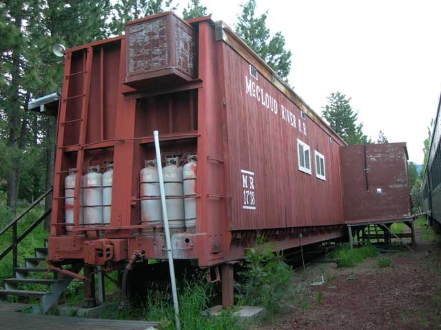 McCloud, CA, 6/2008. This #1713 is the kitchen car where all meals for the Shasta Sunset Dinner Train were prepared. This car was converted from a standard 62-foot long bulkhead flatcar, specifically ex-Northwestern Oklahoma Railroad #21203. The conversion was completed by the McCloud shops in the first half of 1997. The car was heavily damaged by fire in the later part of 2002, but was quickly re-built.