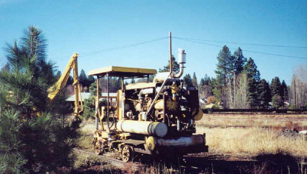 McCloud, CA, 11/2002. From left-right from the back of the caboose: Unidentified; Ballast Scarifier; Ballast Tamper; Ballast Regulator.