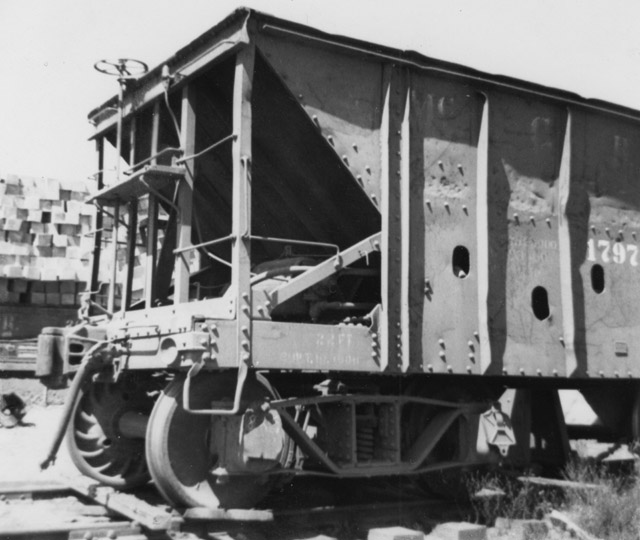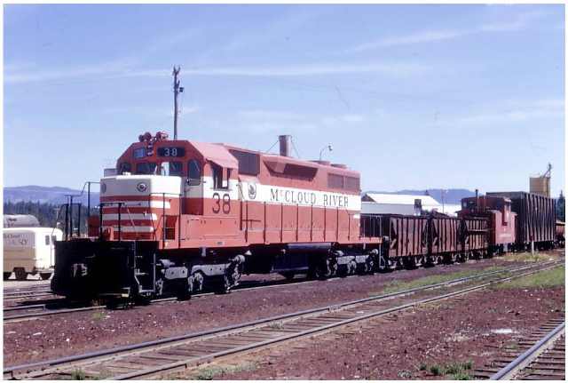 Locomotive #38 and a caboose are spliced by three of the McCloud's ex-GN ore jennies in this photo