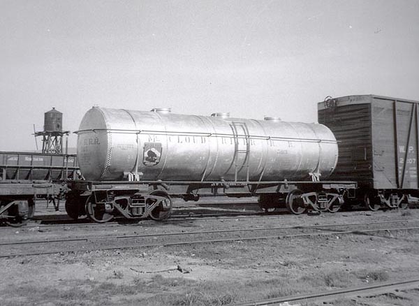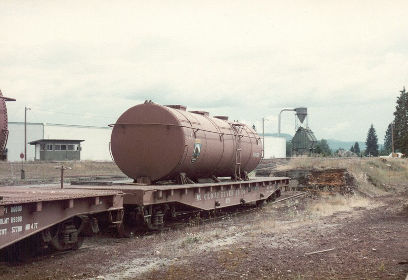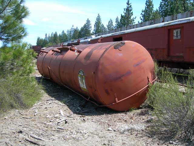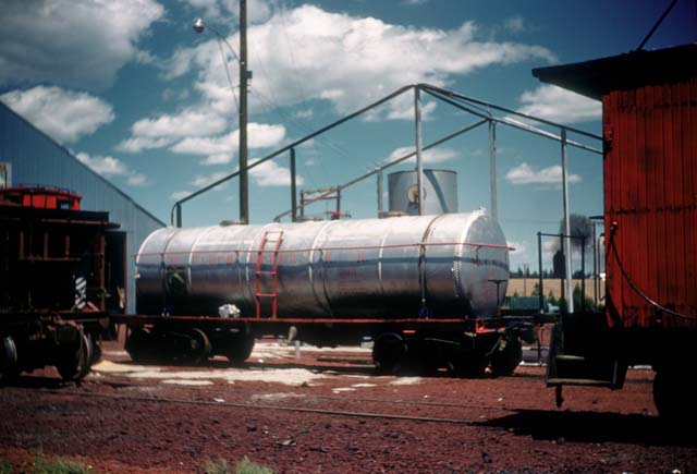 #821 (#504) Converted 7/1972 from maintenance flat #821. Consisted of an 8,000-gallon tank car body, probably salvaged from #2005, #2008. #2010, or #2011, mounted on the flat. Referred to as #504 after 1977 in The Official Railway Equipment Register, though photographs show the car only stenciled as #821. Sold to McCloud Railway in 1992. Retired 1993, with the #821 converted to equipment transport flat #821. |