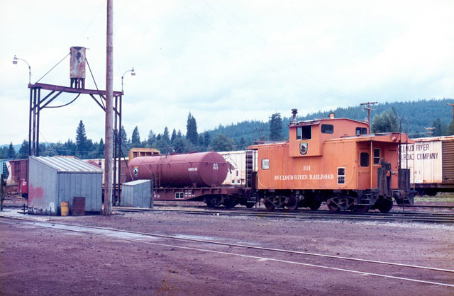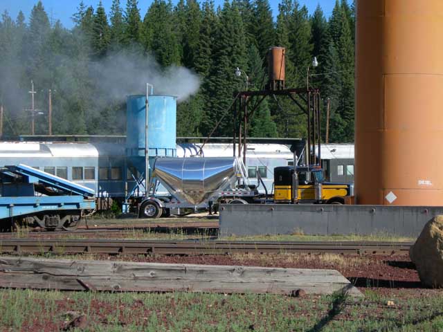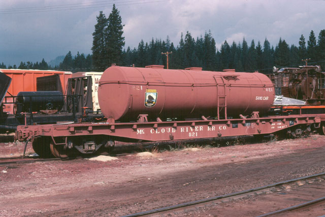 The McCloud River Railroad maintained a classic locomotive sanding facility adjacent to the McCloud turntable through the steam era. In 1957, the railroad started building a new sanding tower to supply the diesel locomotives then coming into service. A hopper constructed next to the tower stored sand, and the McCloud shop built a sand car to transport sand to McCloud. When empty, the railroad would haul the car to one of the connecting carriers, who would fill the car and return it loaded to McCloud. A second sand car replaced the hopper by the late 1970s, and then a new hopper constructed by the McCloud Railway replaced the sand cars altogether. |