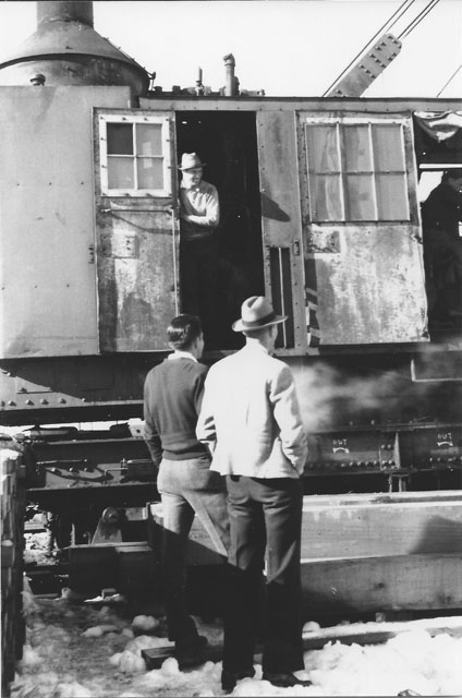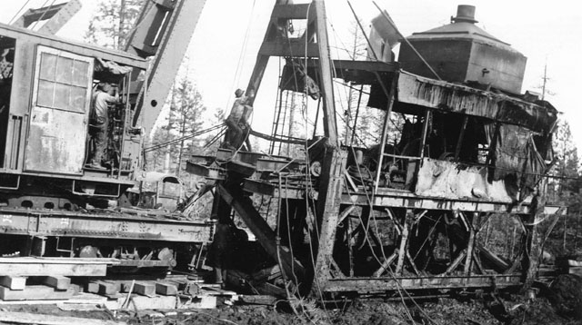 view of crane #8 picking up a McGiffert loader that fell over. Dennis Sullivan collection.