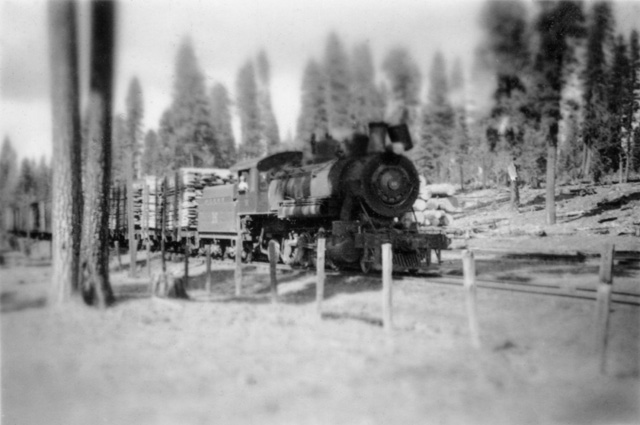 An almost new #28 leading an eastbound train bound for Lookout through Camp No. 2 on 10 June 1950. The freight is passing a railfan excursion returning westbound to McCloud. Jeff Moore collection. |