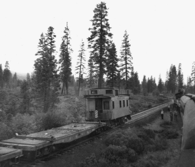 An ex-Great Northern caboose bringing up the rear of the Lookout Job on 10 June 1950. The log flats in front of the caboose are destined for the lumber company at Spur 526, where they will be taken on to the Widow Valley camp for loading. Jeff Moore collection. |