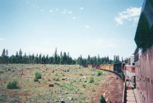 (Picture #98) near Cayton, CA, 5/2003. Twenty-four empty cars are stretched out behind the power this day. The empties are two covered hoppers for Dicalite at Cayton and 16 empty centerbeams and 8 empty woodchip hoppers for Sierra Pacific. |