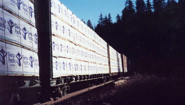 The Sierra Job was called that because it existed primarily to service the Sierra Pacific Industries sawmill located west of Burney. This job generally worked two or three days a week, depending on the shipping needs of the sawmill. It also performed any other work that needed to be done on the Burney branch, usually restricted to switching the Dicalite loading facility at Cayton. The Sierra job usually operated McCloud-Burney and return in one day. Speed restrictions imposed by declining track conditions caused this job to consume two full days in the last several years of operation, with the train running from McCloud to Cayton on the first day and completing the round trip on the following day. This train was usually 7 to 15 cars long and consisted of three types of cars, centerbeams and woodchip hoppers for Sierra Pacific and covered hoppers for Dicalite. Caboose #102 was still used for most Sierra jobs due to the long reverse move the train must make into the Sierra Pacific sawmill. |