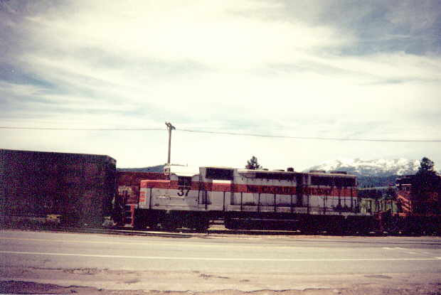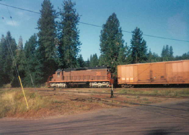 McCloud, CA, 8/1992. Locomotive #38 is seen here switching empty boxcars while working a Yard & Hill job in the McCloud yards. |