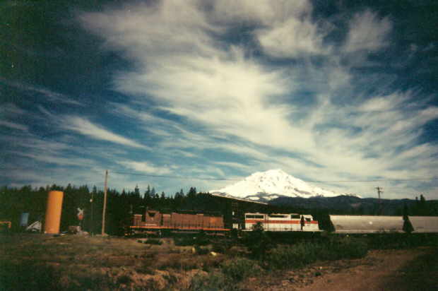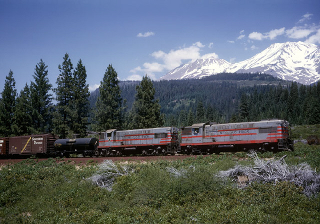 A Yard & Hill Job from an earlier era: Baldwin diesels #29 and #34 moving a Mt. Shasta bound train up the hill in the late 1960's. Photo by and courtesy of John West. |