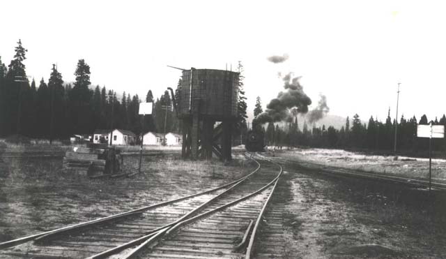 The water tank at the upper end of the McCloud yards with one of the mikados in the background.