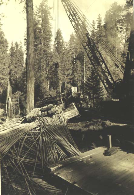 Below are several pictures of the aftermath of a wreck on the Pit River Railroad. This derailed cars carried rebar and other structural steel bound for use in the dams and other concrete structures built by Pacific Gas & Electric Company during the early 1920's. |