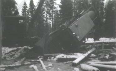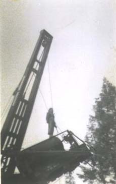 Trackage on the McCloud River Railroad has almost always been light and sometimes uncertain, which has posed many problems for the company as new technologies came into use. The first diesel on the railroad- the #28 in 1948- spent most of its early career on the ties rather than on the rail, and it continued to end up on the ground until the trackwork improved. This same process repeated itself when Jordan spreader #1850 arrived on the railroad in 1952. This series of shots shows one of the early cranes retrieving the Jordan after one of its many early ventures off the rail and into the woods. |
