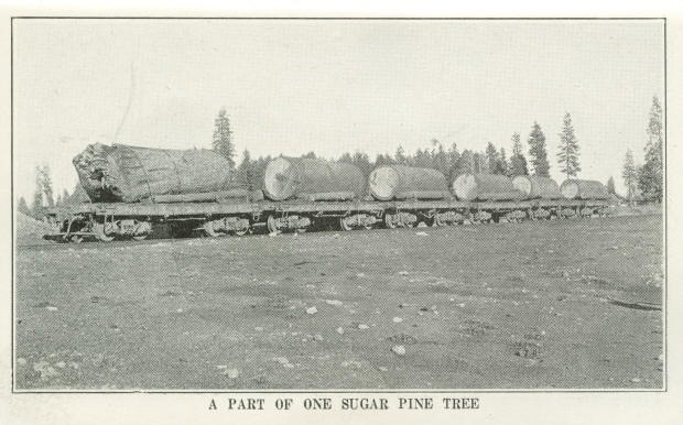 | Part of a single Sugar pine tree loaded onto several of the 28-foot flatcars that the railroad used in the early years. Photo from a 1932 yearbook published by the lumber company. | |||||||||||||||||||||||||||||