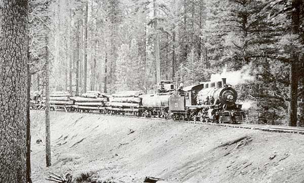 | Steam locomotive #25 leads a water car and a log train. The McCloud River Railroad purchased six of these