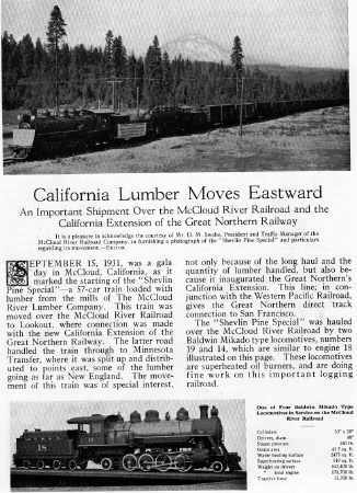 of Bend, OR was reached in 1912. By 1924, a railroad financier named Arthur Curtiss James held seats on the boards of both the Great Northern and Western Pacific railroads. James envisioned a joint GN-WP line that could, in combination with the Atchison, Topeka & Santa Fe, provide competition to Southern Pacific's monopoly on north-south rail traffic along the Pacific coast. GN resumed building south from Bend in 1926 and reached Klamath Falls in 1927, partially on trackage rights over SP's main line between Chemult, Oregon, and Klamath Falls. In the middle of all this the McCloud River Lumber Company purchased from Red River the harvesting rights to the White Horse tract, 80,000 acres of pine primarily in southwestern Modoc county. GN either had some hand in orchestrating the sale or otherwise immediately recognized the potential of establishing a connection with the McCloud River Railroad, as within a month the GN inked two deals with the lumber company, the first to lease to it rails, switches, and other track materials to be used in the mainline logging railroad from the eastern end of the McCloud River Railroad into the sale, and the second a ten-year option to buy the line from the lumber company. The McCloud River Railroad purchased the lumber company's line from Car A to Hambone, and the lumber company immediately used those rails to build a logging railroad from Hambone through some lands the company had already logged over and then a recent lava field into the White Horse tract, where the lumber company established another semi-permanent logging camp at White Horse. Like Pondosa, White Horse would serve as the base of operations for loggers and railroaders working in the woods.In February 1929 the Great Northern and Western Pacific filed a joint application to construct a railroad between Klamath Falls, Oregon, and Keddie, California, together with a 33-mile branch running from Lookout Junction west to Hambone. The Interstate Commerce Commission approved the line in June 1930, and work started form both ends immediately thereafter. A second rail lease allowed the McCloud River Lumber Company to extend its logging railroad mainline from White Horse to Lookout Junction. The GN and WP met at Nubieber, California, on 10 November 1931; on that same date the two roads excercised their option to purchase the lumber company mainline from Lookout Junction to Hambone. WP eventually sold thier half interest in the branch to the GN in exchange for trackage rights on the Bieber-Lookout-Hambone line, which the company never used. | |||||||||||||||||||||||||||||