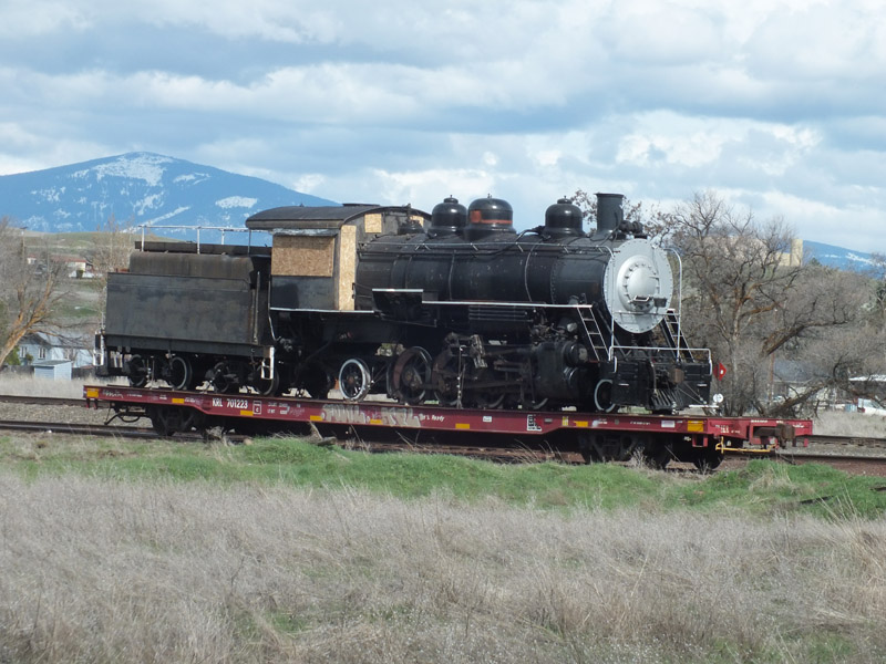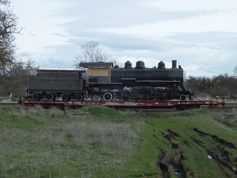 Two views of the #19 loaded on a flatcarin Montague, California, on 19 March 2017, waiting to be picked up by the Central