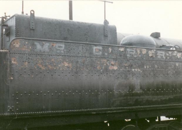 | A close up of the remnants of the McCloud River lettering and number on the side of the tender. |