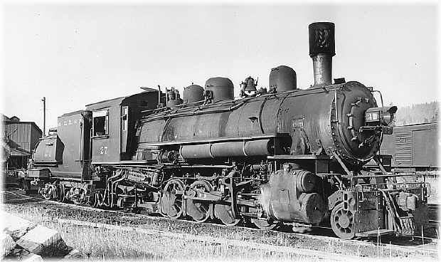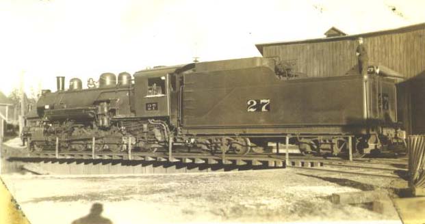 | This photo shows the #27 sitting on the ready tracks in front of the McCloud roundhouse, which is just visible in the background. Note that the large tender has been replaced with the smaller Vanderbuilt tender. Photo from the George Landrock collection. |
