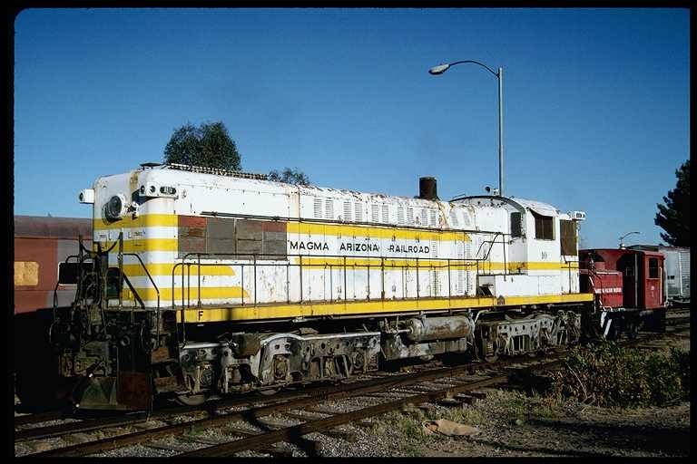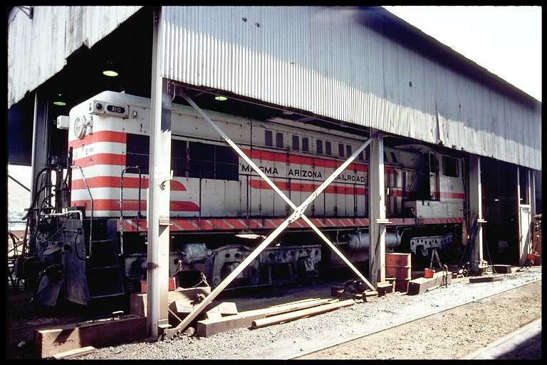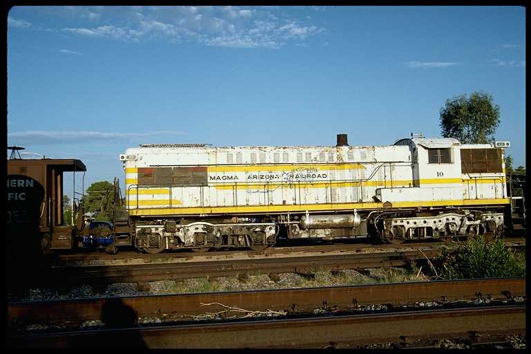 | The #29 is seen here in 1978 as Magma Arizona Railroad's #10 in their open air enginehouse in Superior, AZ. The Magma Arizona kept the McCloud paint basically intact, changing only the number and lettering. Later on the Magma Arizona painted yellow stripes over the red stripes. Photo is by Bart Barton and is from the collection of the Arizona Railway Museum . |