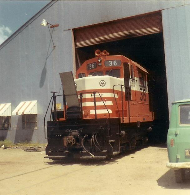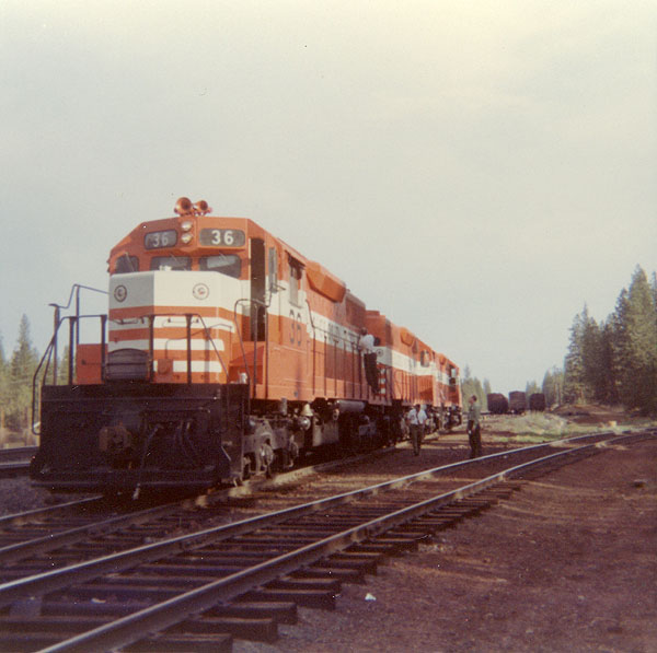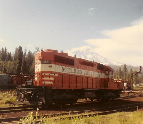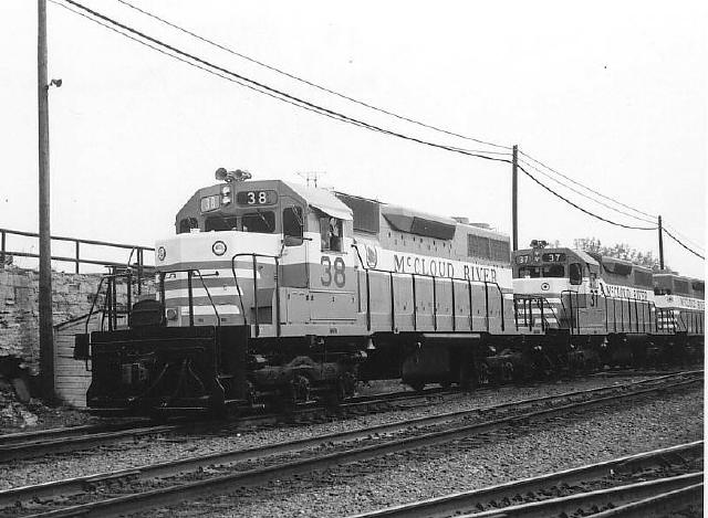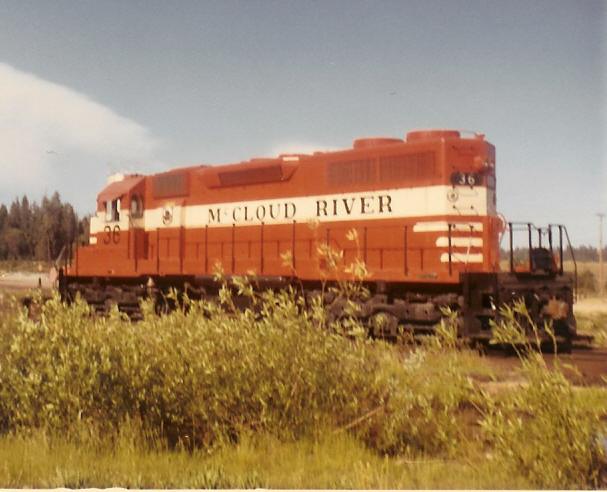 The three SD38's arrived at Lookout Junction during the afternoon of Friday, 9 May 1969. The nightly Lookout job brought the new locomotives to McCloud that night. The #36 is seen here poking its nose out of the shop building on the morning of Saturday, 10 May 1969, less than a day after reaching home rails for the first time. The locomotives officially entered service on Tuesday, 13 May 1969. Photo by and courtesy of Dennis Sullivan.