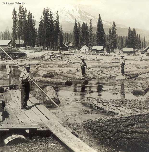 A view of the log pond from the Marc Reusser collection. The men on the logs used the long sticks they are holding to move the logs around the pond.