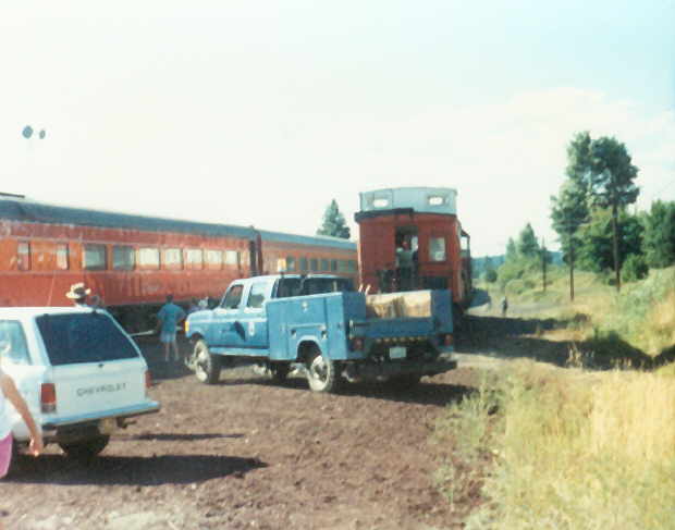 On 14 July 1991, a Southern Pacific freight train derailed at Cantara Loop, CA, where the SP mainline crosses the Sacramento River on a sharp corner. A tank car loaded with metam sodium, a relatively unknown chemical until then, ended up in the river, releasing all 12,000 gallons into the river. The resulting spill wiped out all life in and along the Sacramento River for 42 miles below the spill site. The communities surrounding the spill site were hurt tremendously, but none more than Dunsmuir. The SP led an effort to re-build the local communities. One of the moves they did was to bring the former SP steam locomotive #4449 down from Portland to run three days worth of excursions between Redding and Mt. Shasta City over Labor Day weekend. All proceeds from the trips were given back to the affected communities. Mt. Shasta City was to be the northern terminus for the trips, and all passengers would be let off there to wander around the town while the train traveled north to Black Butte to be turned on the wye. The McCloud River Railroad set up a small display consisting of locomotive #39, the VIP caboose, and a hi-rail pickup in the Mt. Shasta City yards, and the president of the McCloud River was on hand to welcome people to the caboose and answer questions about his railroad. |
