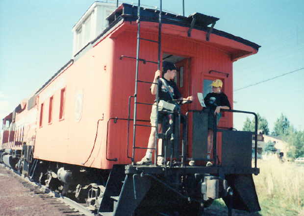 (Picture #232) Two young railfans stand on the back platform of the McCloud River’s VIP caboose. Photo by Anna Moore |
