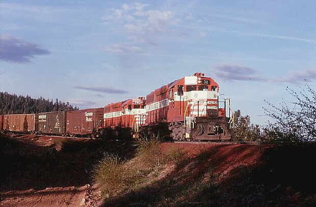 (Picture mccrrr0172) This is a photo of two units near Signal Butte switchback powering a Yard & Hill job between McCloud and Mount Shasta. Photo by and courtesy of George Landrock. |