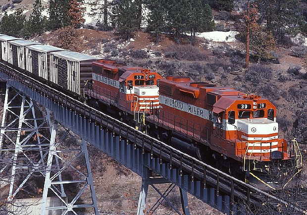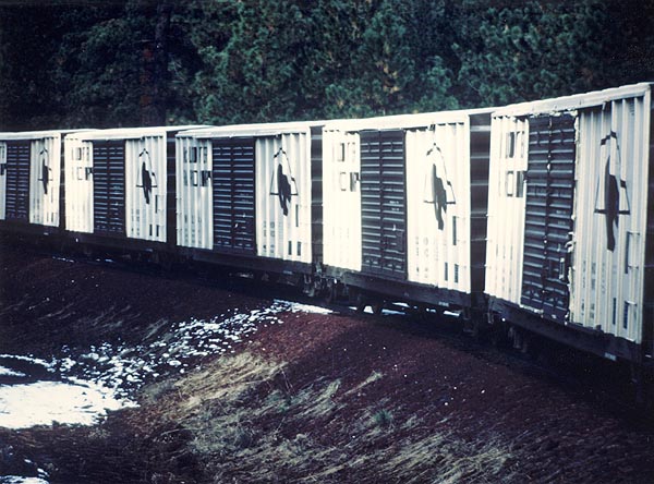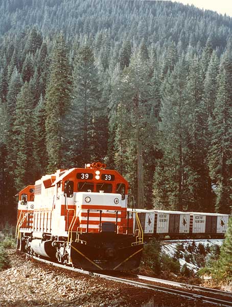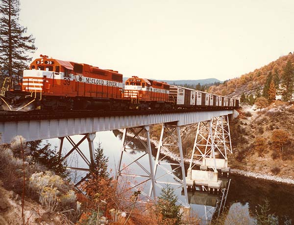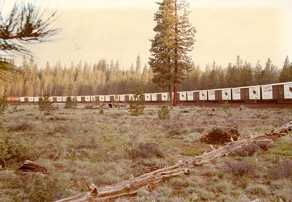 Shortly after the McCloud River Railroad leased 400 new boxcars from owner Itel in 1977 the parent company had the railroad run a special freight with the new boxcars out to Burney and back. The company hired a professional photographer to take photos of the train at points along the way. These photos are presented here courtesy of Travis Berryman. |