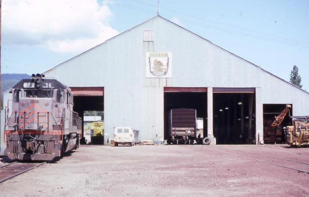 Jerry caught the #36 sitting in front of the shop building in September 1991, with ex-Alaska GP-7 #1804 visible through the open shop doors, along with a McCloud boxcar and a Burro crane. |