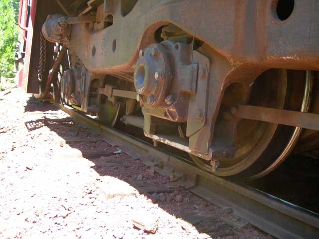The original plans called for the #37 to take the centerbeams as far as Cayton, where the train would be left for the night. However, those plans changed in the afternoon when the train found a section of wide gauge near Milepost B-38. Two wheels of the rear truck of the #37 and three wheels on the lead truck of the first centerbeam fell through the hole and onto the ties. This was the third derailment to happen on this curve since the beginning of the year. This picture shows one of the wheels of the locomotive sitting inside the rail. |